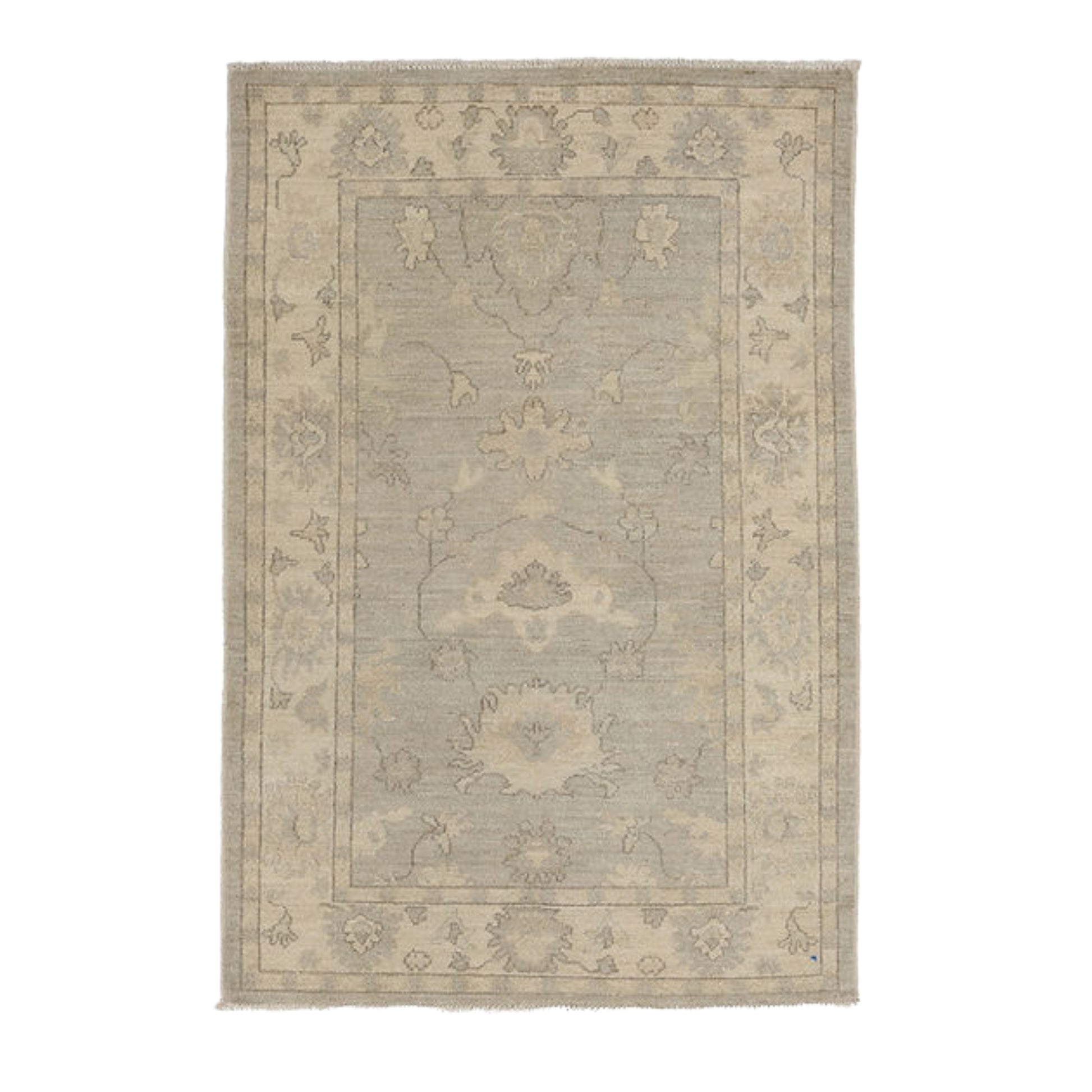 The soft grey field is gracefully accented with light blue and beige tones, bringing a delicate and calming color palette to any setting. Its rectangular size fits beautifully in entryways, side-room seating areas, under small tables, or layered within larger spaces for added depth and interest.